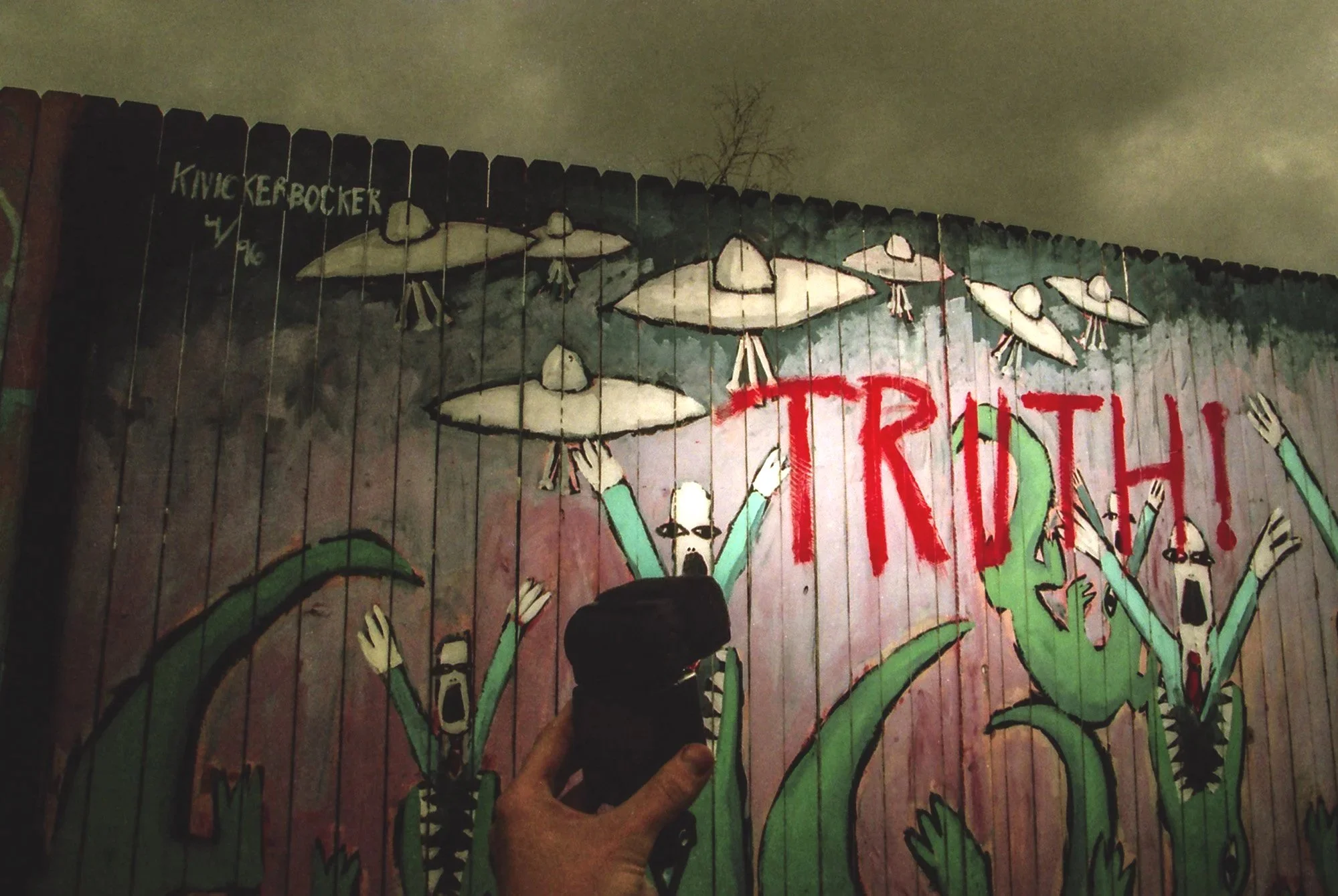 Recently, the single word “TRUTH!” was painted in vivid red on an Orange Avenue fence mural in Orlando near the railroad tracks north of Marks Street. The existing painting is a work by Chuleota artist Carl Knockerbocker and was painted more than three years ago. In the painting “Florida Millennium,” cartoon-like businessmen are devoured by gators as UFOs sweep in from the skies.