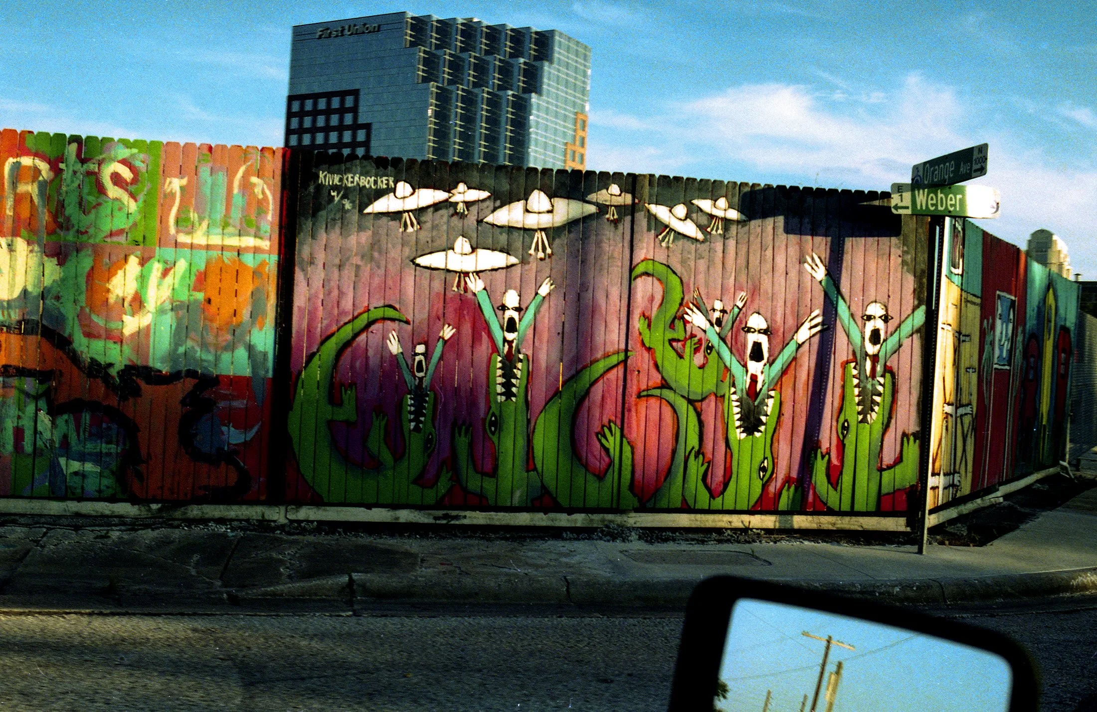 The fleeting images are paintings on a construction fence that make a mysterious contrast to the Orlando skyline. For drivers zipping by at 30 mph, they are a quirky accent against a backdrop of staid office buildings made of glass and concrete.