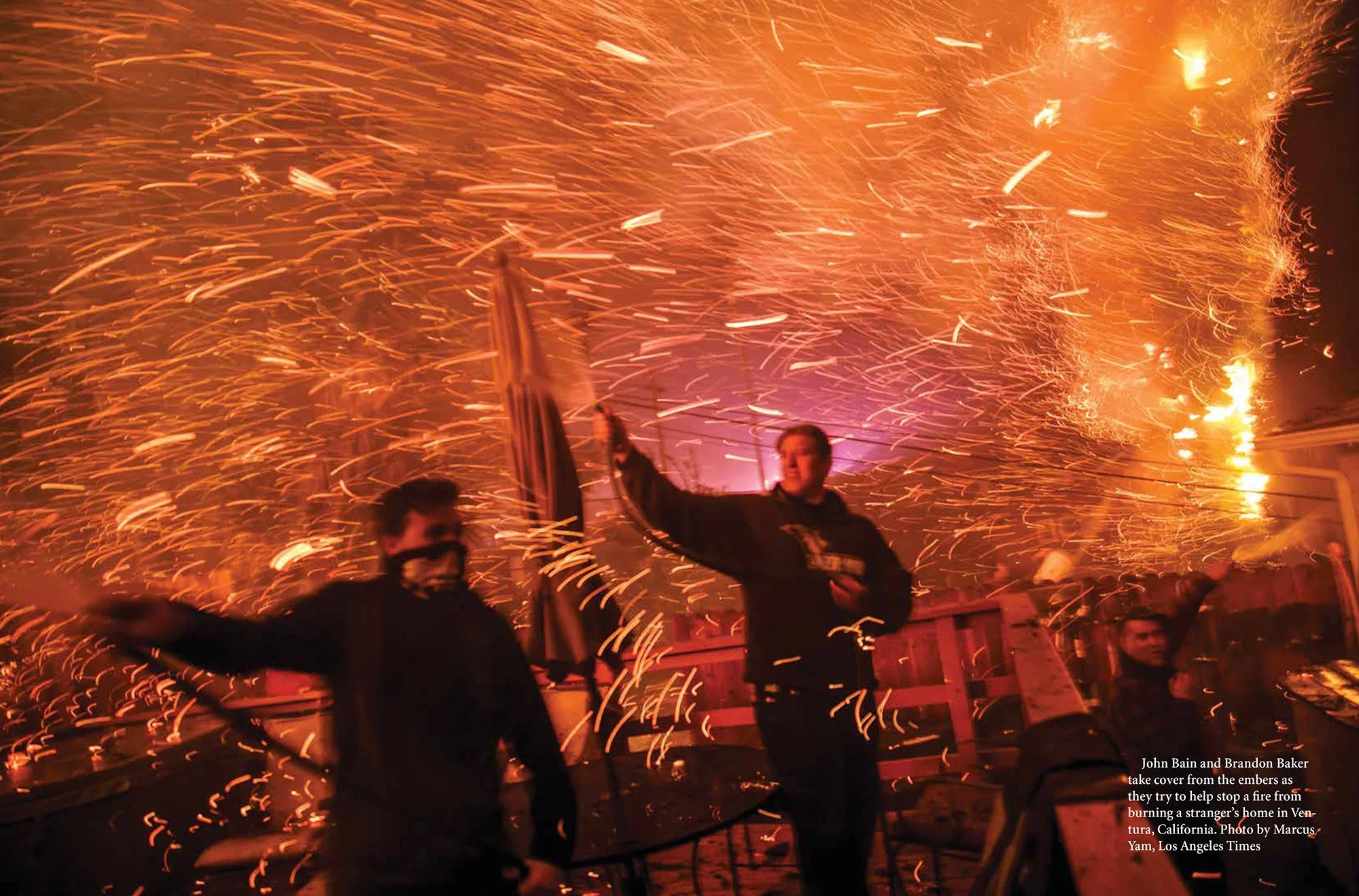 Yam found himself using that strategy covering the Ventura fire in California last December. He had reasoned, based on wind patterns, that a fire in Santa Paula would eventually burn into Ventura. He drove there and ended up at Grant Park, a hilltop overlook. Ten minutes later, the fast-moving fire had reached there. Fire was jumping houses and people were scrambling to evacuate. Yam told himself he would follow the last person out. His escape route was simple to choose. There was only one street in, and one street out.