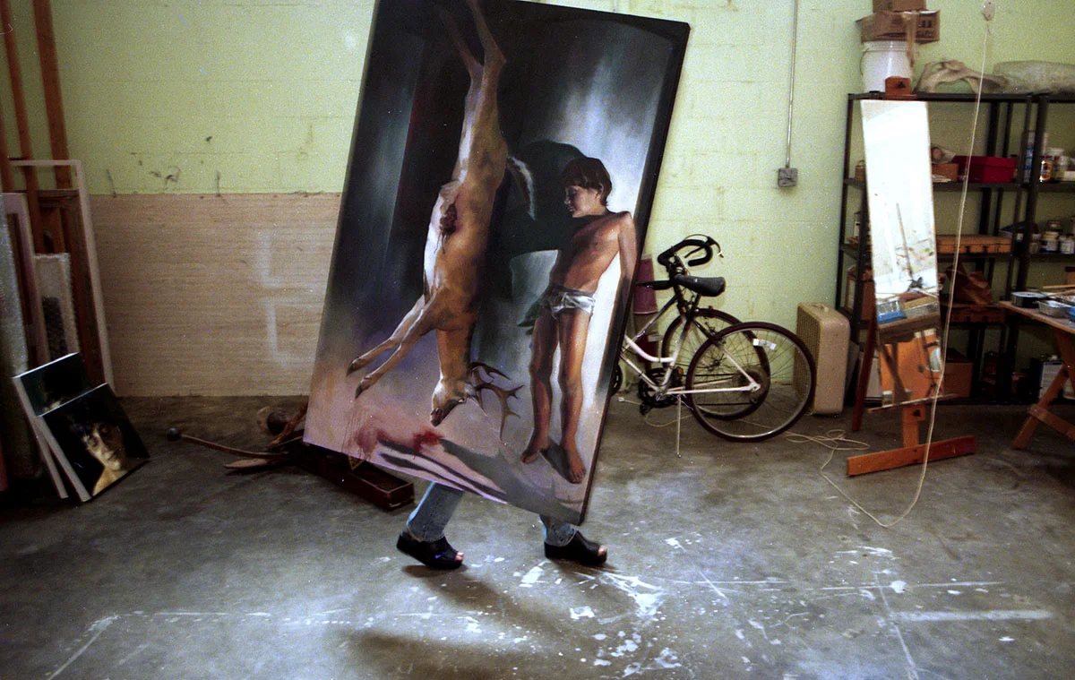 Artist Rima Jabbur moves a painting at her studio in Orlando, Florida. Photo by Tom Burton